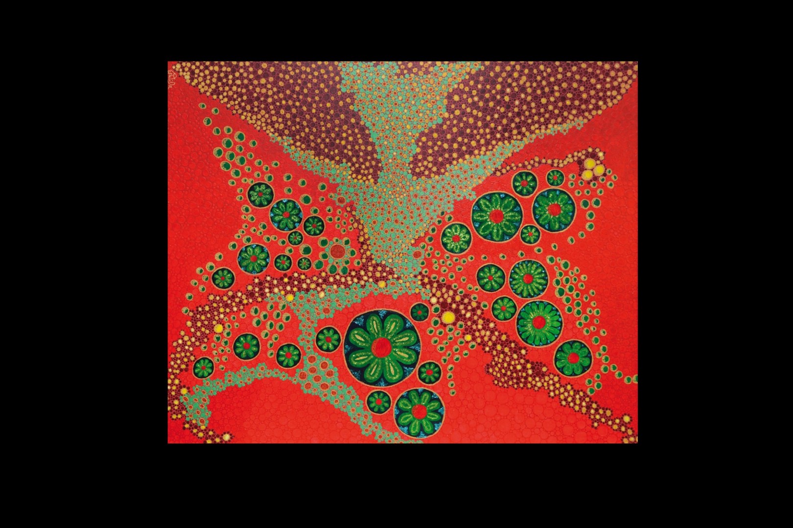 I choose the flower as the center of the universe, from which concentric circles go further and further away. Every leaf, every flower, everything receives light and thus warmth. Even at the most distant angle, the smallest surfaces reflect the light like stars. The presence above this painting structure should call out to the observer: see, here I am and I do good to you and all around you.