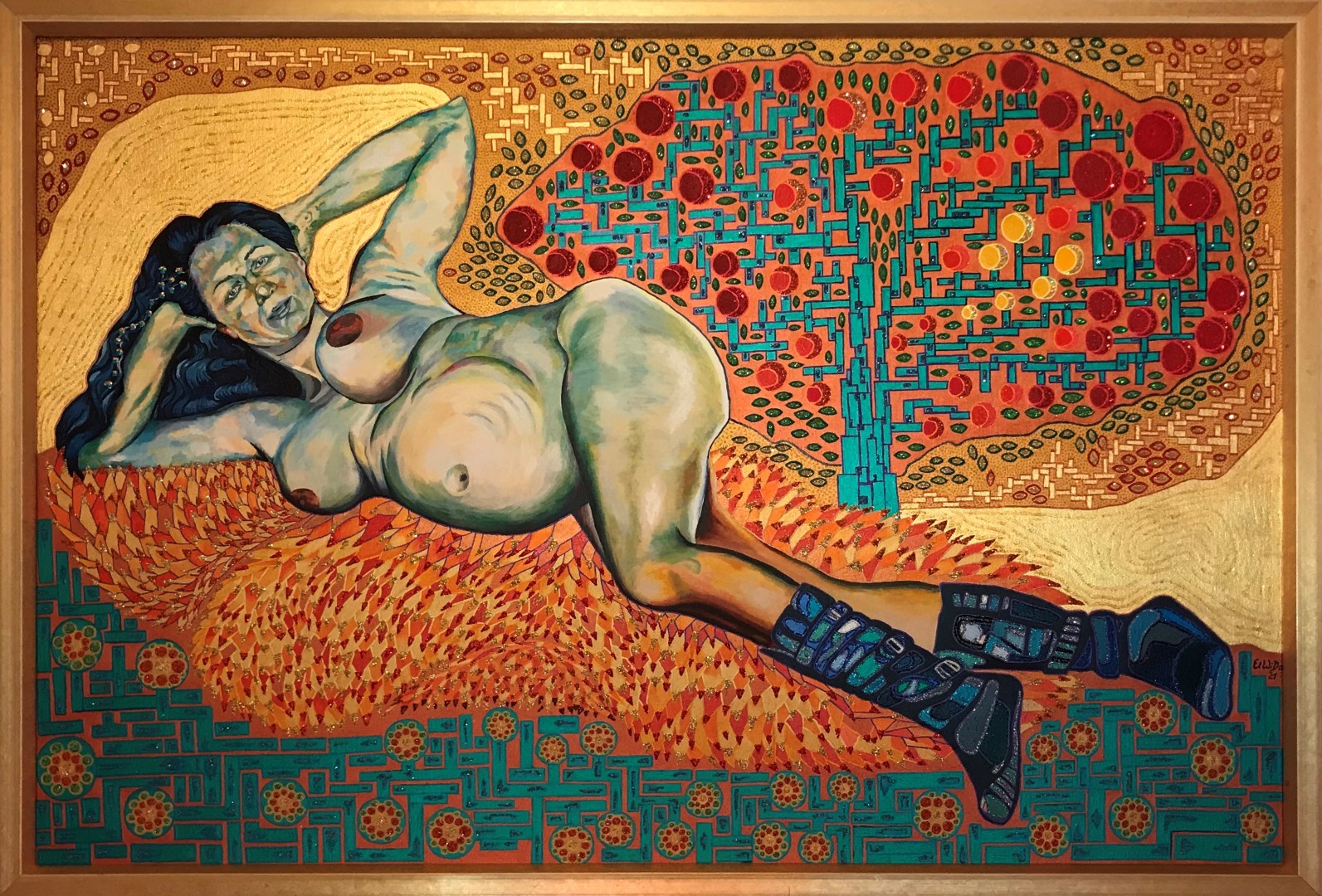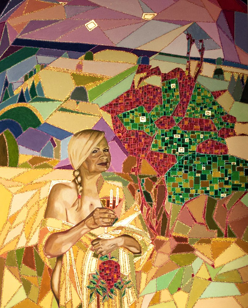 Der Rahmen um die Szenerie stellt das Unbewusste dar, die dominante, kranke Mutter und den kreativen, zurückhaltenden Vater, den starken Vogel im Flug als Verkörperung von Befreiung, auch gespiegelt im Wasser als Wiederspruch zwischen Welt und Scheinwelt, der Schmetterling als Symbol für die unsterbliche Seele, den Baum als das Symbol für die menschliche Entwicklung, die Vergänglichkeit und die Verwurzelung mit einer Gemeinschaft. Alle Symbole sind durch eine besondere Gelschicht hervorgehoben und mit glitzerndem Staub umrahmt Die rechte Frau scheint nicht ängstlich zu sein, sie zieht den Betrachter durch die Augen in den Bann und verbindet sich über ihre Hand mit der Hirschkuh als Zeichen von Verständnis und Anerkennung.