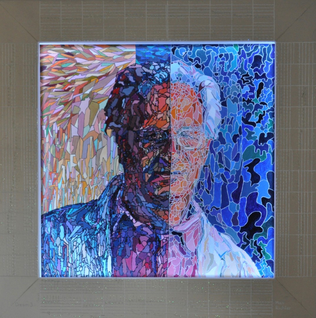 The unconscious influences the dream events: Symbols from the outer frame enter the dream, the inside of the picture. Through the change of colour, the symbols jump out and illustrate the powerful influence of the unconscious.