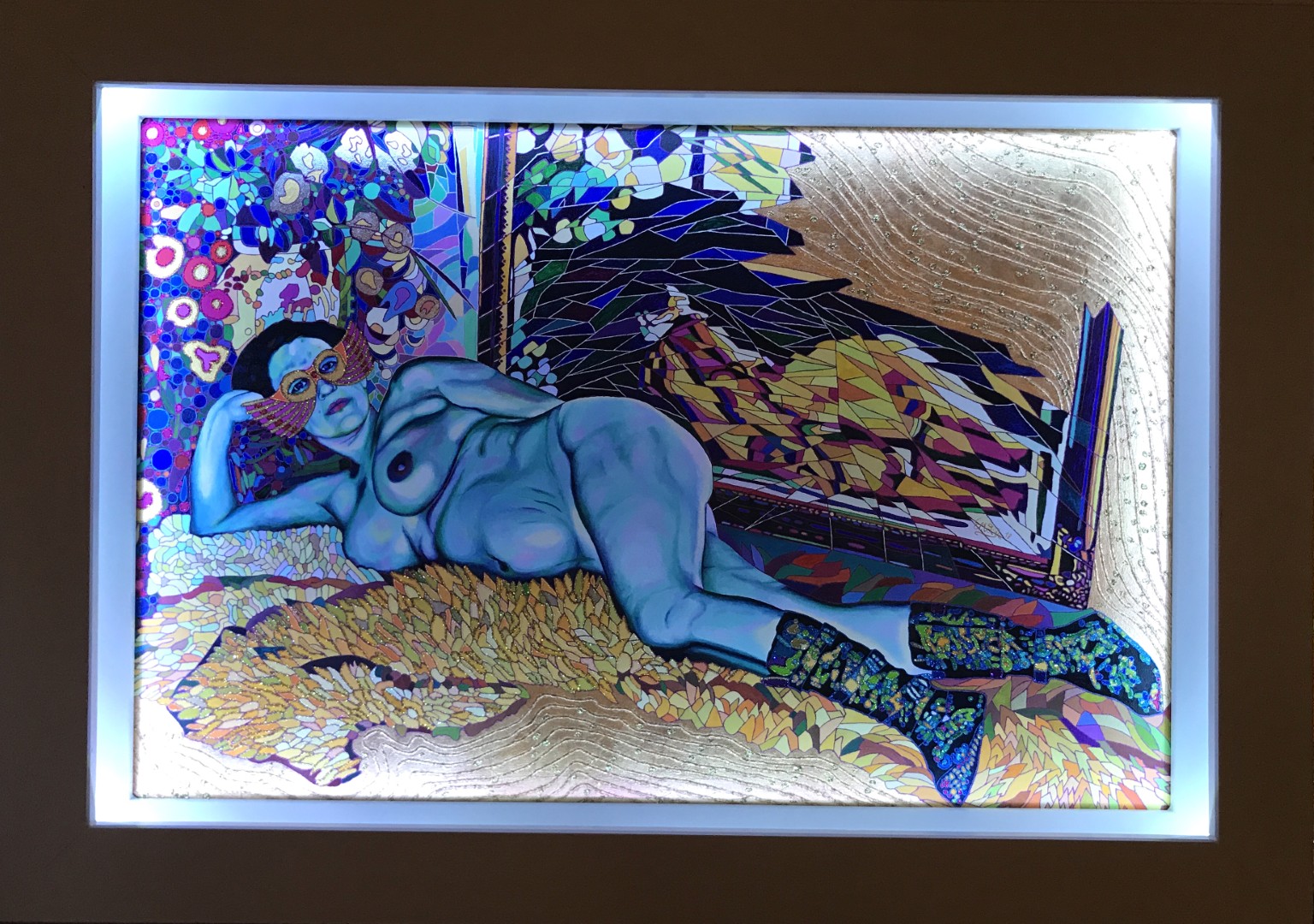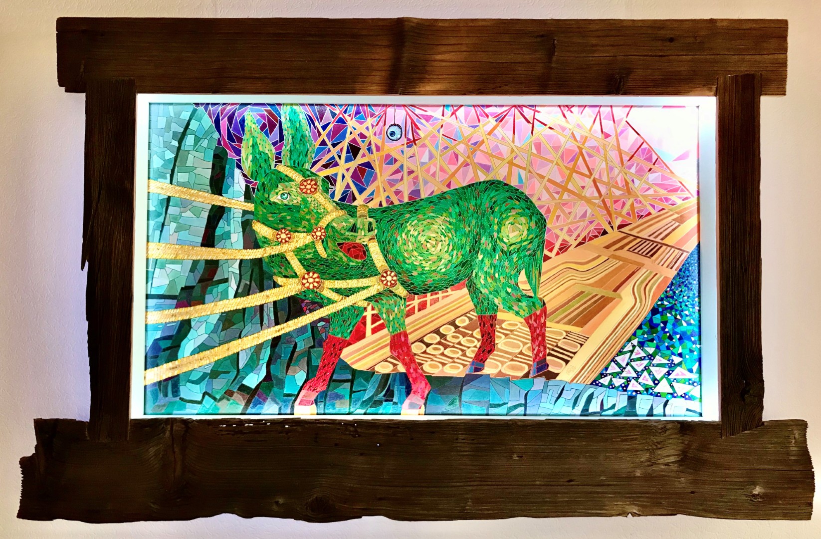 Goldene Blätter flirren beim Standortwechsel des Betrachters. Farbiges Licht verwandelt die Situation in eine Abendstimmung (blaues Licht) in Frühling (gelbes Licht) oder sommerliche Glut (rotes Licht). Der Rahmen aus altem Holz unterstützt die Wirkung des Bildes.