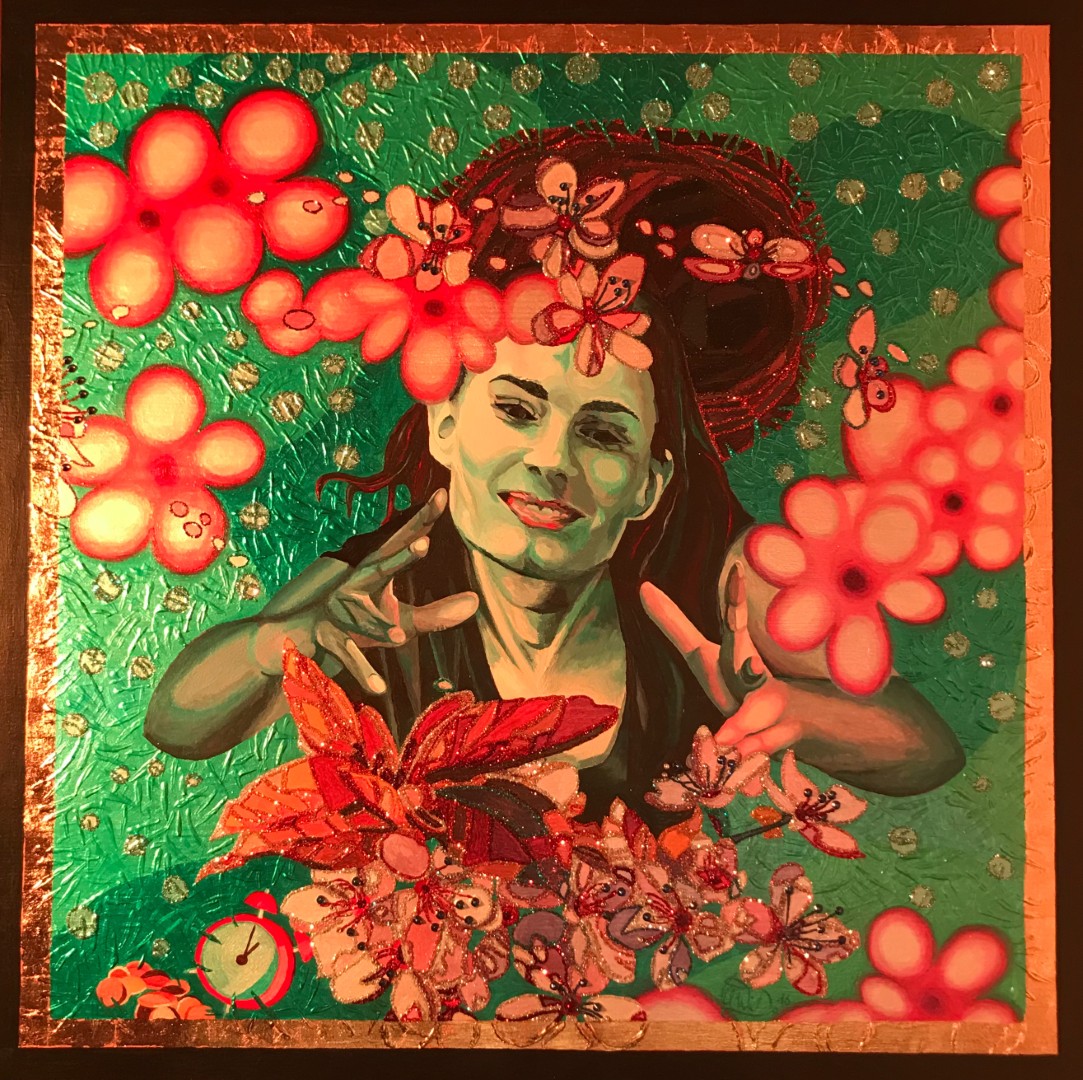 Water Lily Girl 3: Some years after the second painting, I thought it was time to work through the forgetting around that terrible day. If one is not affected oneself, it is easy to forget what should not be forgotten. The history of the years since 2011 tells us again and again that our life is not safe without protection. Find the water lily blossom in the reassembled photo! It disappeared, once and for all, because a lunatic was allowed to do so. I have deliberately used the technique of acrylic-metallic glitter to provoke. The main thing is that we do not forget.