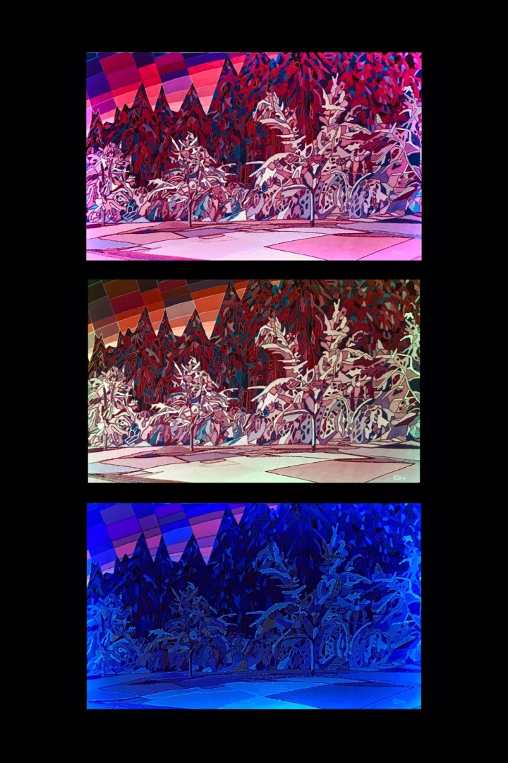 Das einzufangen, war das Ziel: Sobald blaues Licht auf das Bild trifft, liegt alles im Verborgenen. Bezaubernde Elemente im Eis laden zum Träumen ein. Verzückt kann man sich der Vollkommenheit der Natur hingeben. Doch wenn immer mehr rote Bestandteile im Licht auf die gemalte Situation treffen, beginnt ein tiefer Absturz: Das Hochgefühl gleitet in Bestürzung. Denn es wird frei gelegt, was uns erschüttert, so dass der Anblick kaum zu ertragen ist.
